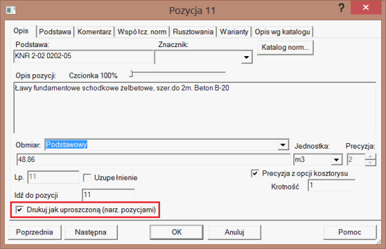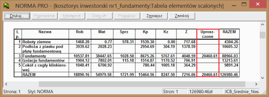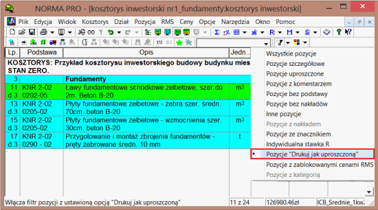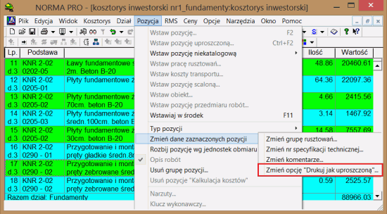 W niektórych sytuacjach istnieje konieczność wydruku wybranych pozycji z kosztorysu szczegółowego w formie uproszczonej. Cel ten możemy osiągnąć stosując dwie metody. Pierwsza polega na zmianie typu pozycji ze szczegółowej na uproszczoną, a druga wykorzystuje nową opcję o nazwie - Drukuj jak uproszczoną - dostępną w Normie począwszy od wersji „4.41”.