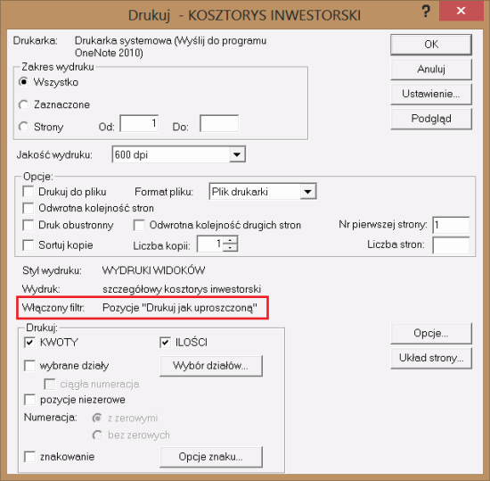Opcja Drukuj jak uproszczoną jest dostępna tylko gdy narzuty w kosztorysie są liczone pozycjami.