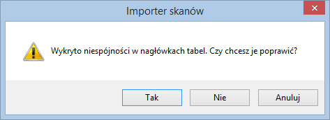Może się okazać, że pojawi się niespójność w nagłówkach stron wczytywanego pliku. W takiej sytuacji wyświetlony zostanie poniższy komunikat: