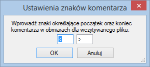 Ustawienia znaków komentarza – w tym komunikacie można określić znaki wykorzystane w importowanym pliku do oznaczania komentarzy obmiarów. Zazwyczaj w przedmiarach używa się proponowanych przez program nawiasów: „<” i „>”.