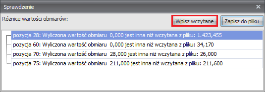 Sprawdzanie – komunikat informuje o rozbieżnościach między wartościami obmiarów pozycji zapisanymi w pliku i wyliczonymi przez Normę. W takiej sytuacji najlepiej wybrać przycisk „Wpisz wczytane”, który spowoduje wprowadzenie obmiarów z pliku źródłowego.