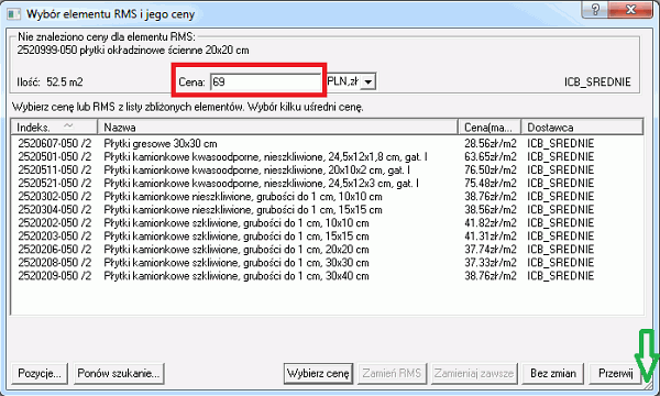 W czasie wyceny kosztorysu (w oknie „Wybór elementu RMS i jego ceny”) może okazać się, że część cen nakładów proponowanych przez program nam nie odpowiada i chcielibyśmy w to miejsce wstawić inne, np. z hurtowni lub składów budowlanych. Do tej pory w takiej sytuacji należało w tym oknie wybrać opcję „Bez zmian" i uzupełnić brakujące wartości po wycenie. W aktualnej wersji Normy można w oknie „Wybór elementu RMS i jego ceny” wprowadzić dowolną wartość lub proste działanie matematyczne. W podanym niżej przykładzie została wpisana wartość 69 zł za płytki ścienne 20*20 cm.