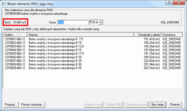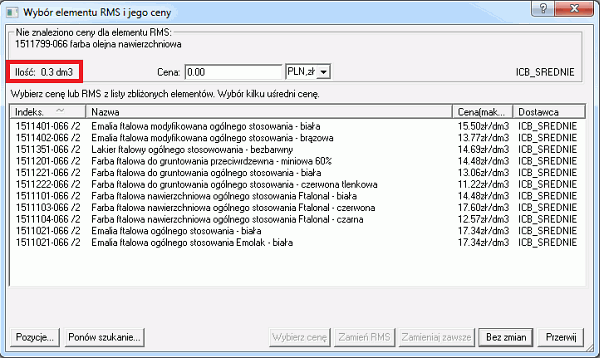 W oknie „Wybór elementu RMS i jego ceny” widoczne są (oprócz jednostek) również ilości RMS-ów z kosztorysu.