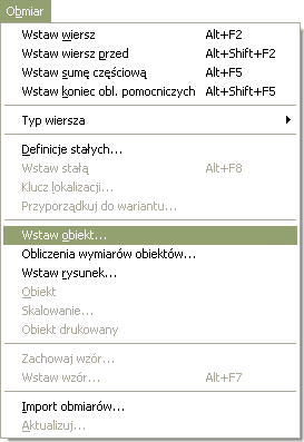 Teraz musimy w menu Obmiar widoku Przedmiar wybrać hasło Wstaw obiekt.