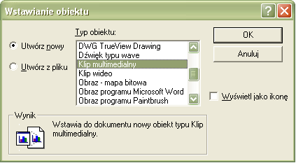 Pojawi się okno Wstawianie obiektu, w którym musimy wybrać hasło Klip multimedialny.
