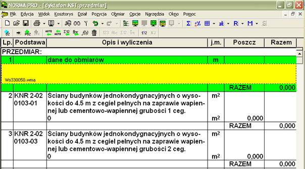 w zeszycie i następnie zebrane dane przepisywał do formularza obmiaru w programie. Tymczasem Norma pozwala na ułatwienie tej operacji. Zamiast notatnika bierzemy na budowę dyktafon i nie musimy niczego pisać. Wystarczy, że po każdym pomiarze wypowiemy na głos wynik i wyjaśnienie, czego pomiar dotyczył. Na przykład: „Wysokość pomieszczenia biurowego – 3 metry 25 centymetrów”. Następnie wracamy do domu lub biura i zapisy dźwiękowe dołączamy do poszczególnych pozycji jako obiekty. W tym celu najlepiej jest zastosować dyktafon cyfrowy z wyjściem USB. Po włączeniu programu tworzymy nowy kosztorys, do którego wprowadzamy potrzebne pozycje z zerowymi obmiarami. Wygodnie jest do tego celu wywołać spis katalogów ikoną