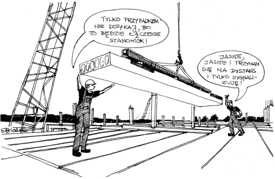 Generalnie rozporządzenie wraca do koncepcji minimum trzyosobowego teamu zatrudnionego przy transporcie ładunków za pomocą żurawia – operator jako kierujący żurawiem, hakowy (albo prędzej hakowi, bo jak będzie tylko jeden, to z pewnością po roku pracy na budowie porzuci to zajęcie aby zostać mistrzem górskich ultra maratonów) jako osoba przeznaczona do zawieszania i odczepiania przemieszczanych przez żuraw ładunków oraz sygnalista, który jest odpowiedzialny za przekazywanie sygnałów i komunikatów między operatorem żurawia a hakowym. Taki swoisty interface. Wydaje się jednak, że w czasach bluetooth’ów i telefonii komórkowej zaszczytna funkcja sygnalisty powinna zniknąć na rzecz bezpośredniej komunikacji operator – hakowy; no, ale przecież zdarzają się awarie, niepodpięte ładowarki i tym podobne sytuacje, poza tym przepisy nakładają na sygnalistę kilka dodatkowych obowiązków – ma określać drogę przemieszczanego ładunku, obserwować go w trakcie transportu i wydawać odpowiednie polecenia, a w przypadku wystąpienia sytuacji niebezpiecznej wstrzymać prace i ostrzegać przed zagrożeniem. W sumie te rzeczy przy naszym stopniu rozwoju łączności mógłby robić także jeden z hakowych, gdyż wyznaczona dla niego rola nie jest zbyt skomplikowana – zapoznaje się z ładunkiem, określa jego masę, położenie środka ciężkości, położenia punktów mocowania, stosuje odpowiednie elementy do zawieszania i mocowania ładunku. Tu jednak rozporządzenie wyraźnie rozdziela wszystkie te trzy role i wprost zakazuje wykonywania przez jedną osobę jednocześnie czynności operatora żurawia, sygnalisty lub hakowego.