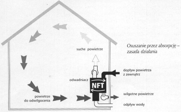 Na innej zasadzie działają pozostałe metody osuszania. W kontakcie z wilgotnymi przegrodami suche powietrze jest w stanie odebrać z nich nadmierną ilość wody. To zjawisko jest podstawą osuszania absorpcyjnego. Powietrze jest osuszane przez specjalny absorbent (np. żel silikonowy, chlorek litu lub żel krzemionkowy) i po ogrzaniu wraca do pomieszczenia. Natomiast wilgoć odebrana z osuszanego powietrza jest odprowadzana na zewnątrz (rys. 2). Proces trwa tak długo, aż osiągnie się założoną wilgotność masową przegród lub tzw. wilgotność równowagową. Dlatego okna i drzwi podczas osuszania powinny być zamknięte. Zaletą jest możliwość osuszenia trudnodostępnych, zawilgoconych miejsc budynku. Trudny do określenia jest jednak czas osuszania.