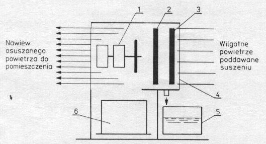 schemat osuszacza kondensacyjnego ([1], [7]) 1. wentylator 2. płyta parownika 3. skraplacz 4. kratka z filtrem 5. pojemnik na wodę 6. pompka |