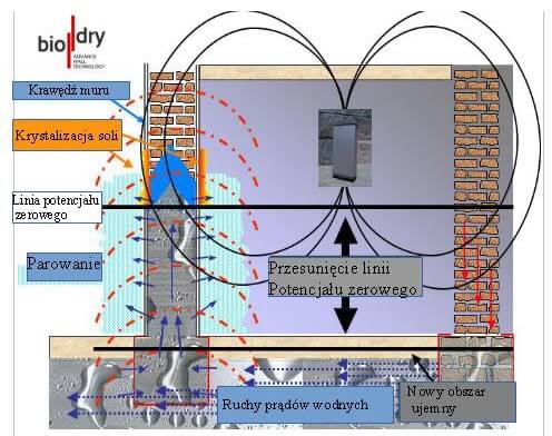 Na zupełnie innej zasadzie działają metody osuszania wykorzystujące potencjał elektryczny i fale magnetyczne. Są to metody całkowicie bezinwazyjne. Podstawą jest zrównoważenie ładunku cząsteczek wody znajdującej się w kapilarach ścian. Jest to realizowane przez zamontowanie specjalnego urządzenia wykorzystującego fale magnetycznego pola ziemskiego, czego skutkiem jest stopniowe obniżanie się poziomu zawilgocenia. Ideę pokazano na rys. 1.