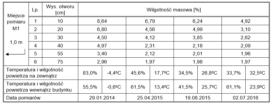 W tabeli poniżej pokazano przykładowe rezultaty badania zawilgocenia osuszanej ściany.