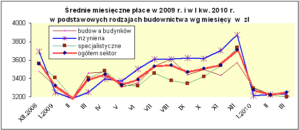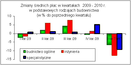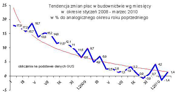 W pierwszych miesiącach 2010 r. nastąpił spadek poziomu płac. Są tego co najmniej dwie przyczyny; w pierwszym kwartale zawsze płace w budownictwie są niższe w porównaniu do wynagrodzenia czwartego kwartału poprzedniego roku (płace grudnia zwiększają średni poziom płac czwartego kwartału). Ponadto wyjątkowo ciężkie warunki atmosferyczne ograniczyły w pierwszych miesiącach 2010 r. produkcję budowlaną o około 20%, co odbiło się ujemnie na płacach.