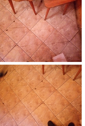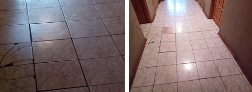 Widać wyraźnie ugięcie warstwy użytkowej co, w połączeniu z widocznym uszkodzeniem na skutek uderzenia, było bezpośrednią przyczyną uszkodzenia okładziny z płytek. Ale to nie jedyny możliwy problem.