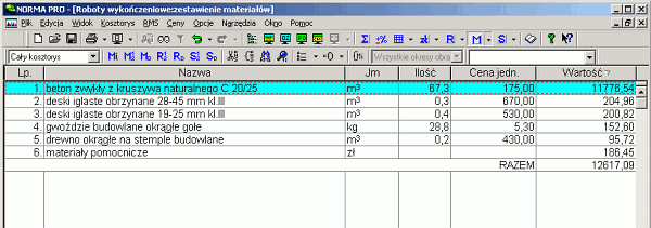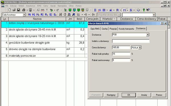 Typowy przypadek – ławy fundamentowe żelbetowe – z dokumentacji technicznej wynika, że należy zastosować „Beton zwykły z kruszywa naturalnego C 20/25”, posłusznie więc w opisie pozycji dopisujemy owe „C 20/25”. Dlaczego tak robimy? – bo w kolejnych pozycjach może wystąpić beton „C 16/20” i inny. Sama zmiana w opisie pozycji, jak należy się domyślać, nie wystarczy. Dlatego pamiętajmy, aby w składnikach normatywnych (RMS) wymienić materiał na dokładnie taki, jak w opisie pozycji. Dzięki temu uzyskujemy również prawdziwe ilości poszczególnych „typów” materiałów. Tym samym, wprowadzając ceny na poszczególne materiały i sprzęt, nie będziemy się głowić: jaki to właściwie powinien być ten „beton” bądź „środek transportowy”.