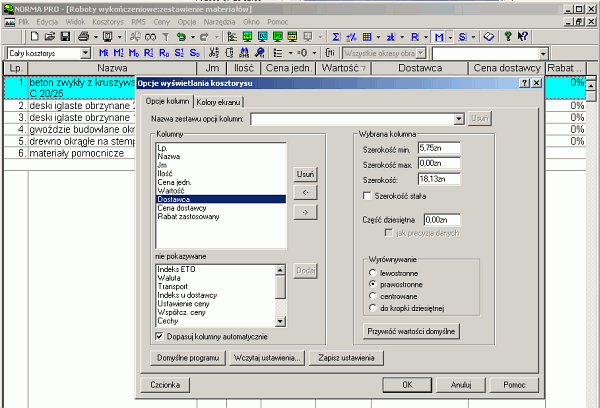 A gdy już powalczymy, to dlaczego by nie skorzystać z RABATÓW? Rabat dobra rzecz, tylko jak go wprowadzić? Jeżeli na ekranie z cenami materiałów nie występują kolumny z rabatami, musimy zmienić opcje wyświetlania. W tym celu wybieramy z menu Opcje -> Opcje wyświetlania kosztorysu i dodajemy niezbędne kolumny: Cena dostawcy -> Rabat maksymalny -> Rabat zastosowany. Teraz, klikając na nazwę kolumny „Cena dostawcy”, mamy możliwość wpisania odpowiedniej ceny wraz z rabatem maksymalnym oraz tym zastosowanym w kosztorysie.