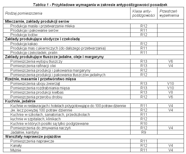 W tablicy 1 podaję przykładowe wymagania w zakresie antypoślizgowości posadzek w zakładach przetwórstwa żywności, kuchniach i warsztatach naprawczych. Pełen wykaz znaleźć można w niemieckich wytycznych: „Fußböden in Arbeitsräumen und Arbeitsbereichen mit erhöhter Rutschgefahr ZH 1/571, IV.1989
