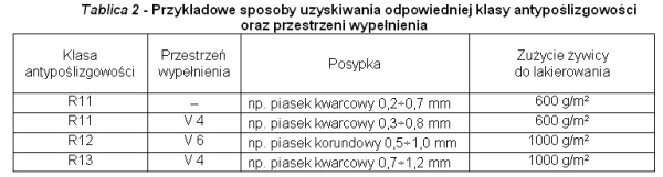 Wymaganą antypoślizgowość nadaje się wykonując na świeżo ułożonej warstwie żywicy posypkę z piasku kwarcowego lub korundu; po związaniu, nadmiar piasku należy usunąć i wykonać lakierowanie powierzchni (patrz tablica 2).