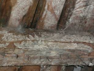 fot. 3 – Grzybnia grzyba domowego białego (Poria vaporaria) na zawilgoconym elemencie drewnianym – fot. M. Rokiel