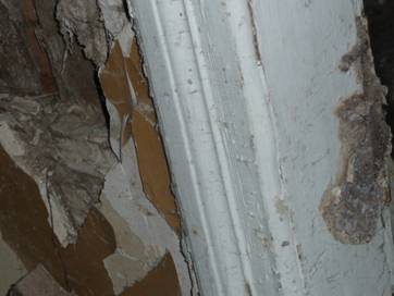 fot. 5 – Niektóre skutki korozji biologicznej mogą ujawnić się po dłuższym czasie od zalania. Pomieszczenie gospodarcze po ok. 9 miesiącach od zalania. Nie przeprowadzano żadnych zabiegów biobójczych. Po prawej stronie (na ościeżnicy) zabrudzona grzybnia grzyba piwnicznego (Coniophora puteana) – fot. M. Rokiel