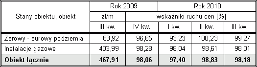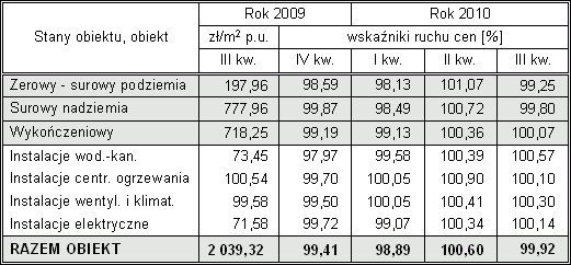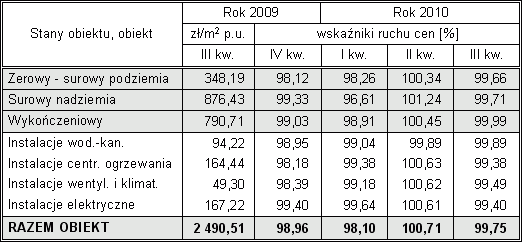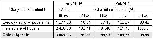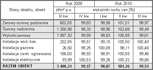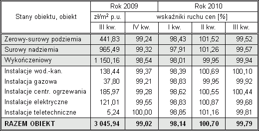 Kolejna informacja o ruchu cen w budownictwie dotyczy okresu od III kwartału 2009 r. do III kwartału 2010 r. Prezentowane dane, wynikające z analizy i porównań dokonanych na przykładzie wybranych jedenastu obiektów modelowych, przedstawiam w ujęciu procentowym. W pierwszej kolumnie zamieszczam ceny jednostki umownej obiektu i wyróżnionych w nim zakresów robót odnotowane w III kwartale 2009 r., co umożliwi Czytelnikom określenie wzrostu cen w dowolnych przedziałach czasowych ostatnich 12 miesięcy.