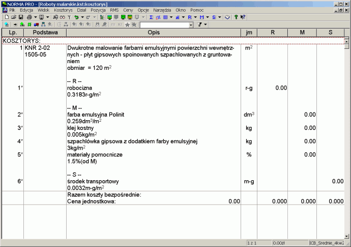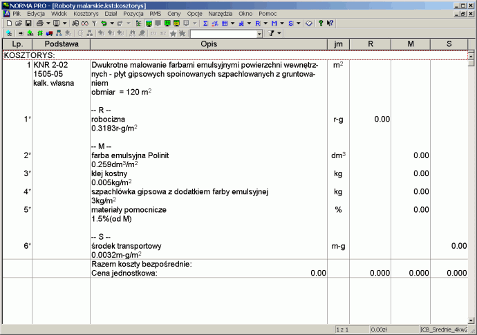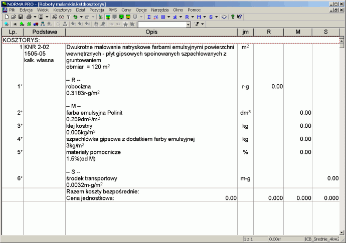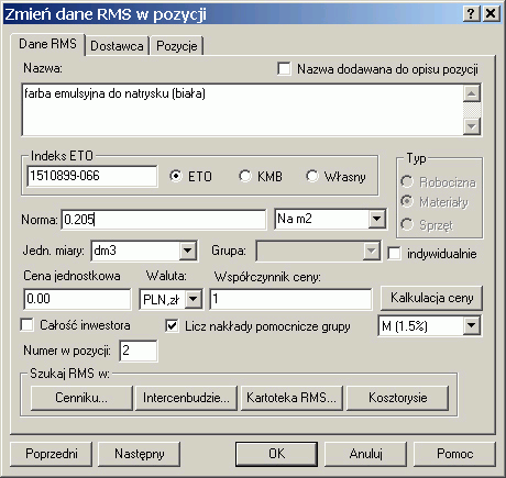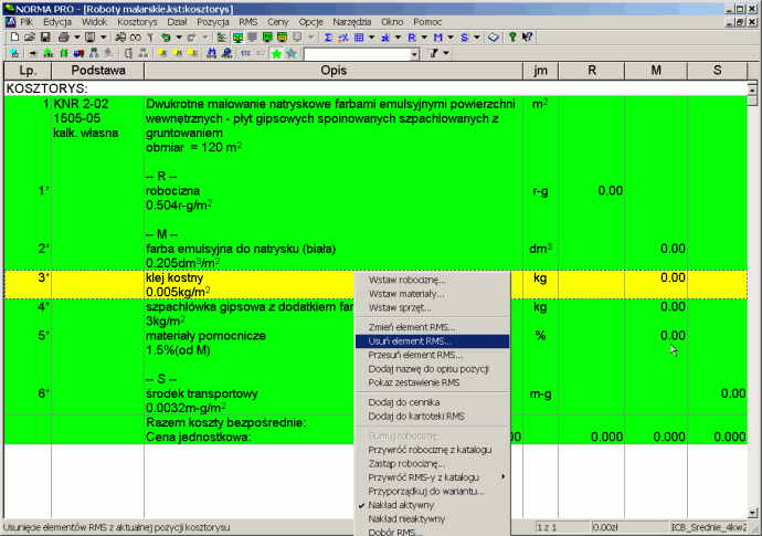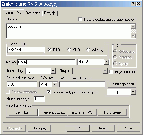 Z kolei, gdy technologia tego wymaga, należy materiał / sprzęt dopisać z odpowiednim nakładem, np. wstaw sprzęt (+S), wstaw materiał (+M).