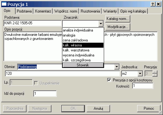 Ponieważ będzie to kalkulacja własna, informację o tym powinniśmy również zamieścić. Możemy tego dokonać poprzez dwukrotne kliknięcie na pozycji i rozwinięcie „Znacznika”, z którego wybieramy odpowiedni opis.
