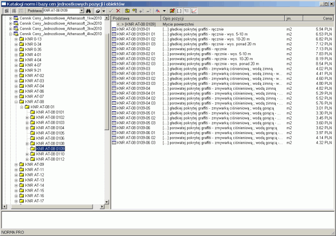 Zdarzają się również przypadki, gdy nie chcemy sporządzać kalkulacji szczegółowej, a interesuje nas jedynie przybliżony koszt wykonania prac. Skorzystamy w tym momencie z Bazy cen jednostkowych pozycji i obiektów („F2”). Jak sama nazwa wskazuje, znajdziemy tam wycenione już pozycje bazy katalogowej. Pamiętajmy zawsze o wybraniu właściwego poziomu cenowego!