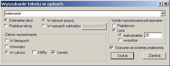 W tym celu naciskamy na ikonkę „Lornetki” i wpisujemy interesującą nas frazę. Ponieważ interesują nas ceny jednostkowe, wyszukiwania dokonujemy w cennikach (haczyk w kwadraciku Cenniki).
