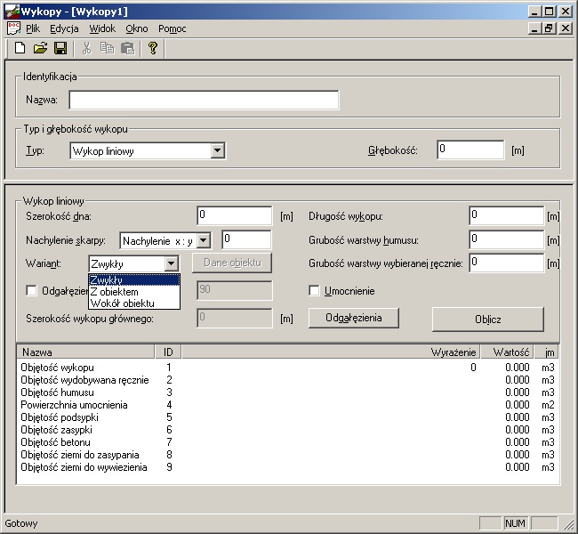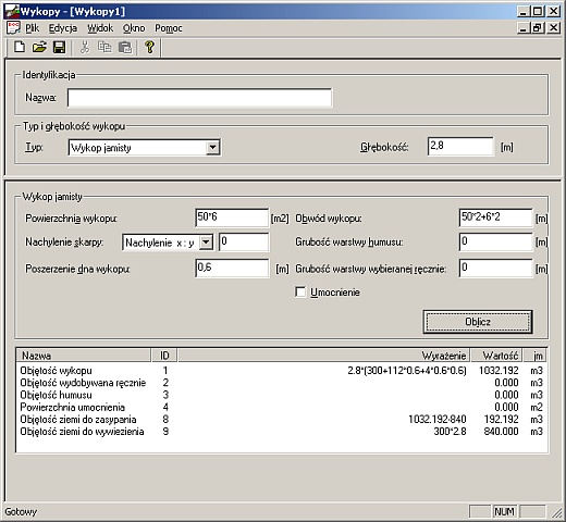 Program pozwala na wykonywanie obliczeń dla wykopów liniowych i jamistych, zarówno zwykłych, jak też odkrywek rurociągów, komór ciepłowniczych itp.