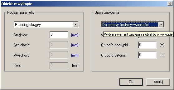 - z obiektem – czyli z umieszczonym w wykopie rurociągiem lub kanałem; po naciśnięciu klawisza „Dane obiektu” należy podać parametry znajdującego się w wykopie obiektu oraz grubości podsypki piaskowej i podkładu betonowego; można również podać, jaka część wykopu ma być zasypana ręcznie: do połowy wysokości, całą wysokość obiektu lub jak wysoko ponad obiekt;