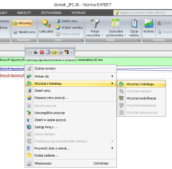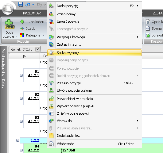Póki co nie ma możliwości automatycznego doboru/ dopasowania pozycji z „Bazy KNR” lub „Cen robót” do informacji dostępnych w pliku IFC, musimy to zrobić ręcznie. Odpowiednią pozycję szczegółową znajdziemy w bogatej bazie KNR, KNNR..., natomiast dla pozycji uproszczonej możemy skorzystać z polecenia "Szukaj wyceny".