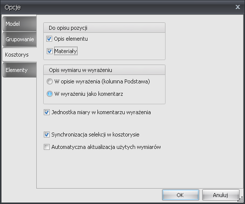 Mamy też opcję synchronizacji selekcji w kosztorysie, gdzie po wyborze pozycji w kosztorysie zostaną zaznaczane elementy na projekcie i odwrotnie.