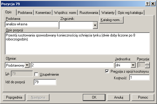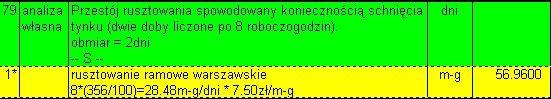 Zakładam, że już wcześniej zostały wprowadzone pozycje na montaż i demontaż rusztowania oraz jego czas pracy. Teraz musimy skalkulować przestój technologiczny.