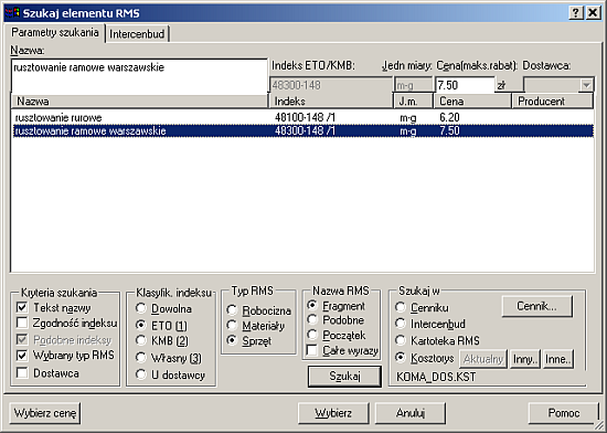 Musimy tu określić kryteria szukania. Zaznaczamy tylko Wybrany typ RMS i Tekst nazwy. Nie zaznaczamy Zgodność indeksu. W polu Nazwa RMS zaznaczamy Fragment i nie zaznaczamy Całe wyrazy. Poprzednio wpisaliśmy tekst „rusztow” a nie „rusztowanie”, bo mogłoby się zdarzyć, że w katalogu, z którego wstawialiśmy pozycję na montaż występował sprzęt „rusztowania” lub „czas pracy rusztowań”. Po naciśnięciu Szukaj uzyskamy w polu wyboru listę wszystkich rusztowań występujących w kosztorysie. Zaznaczamy właściwe i przyciskiem Wybierz wracamy do okna Dodaj RMS do pozycji. Naciskamy OK i do kosztorysu została dodana żądana pozycja.