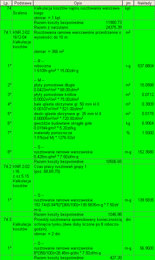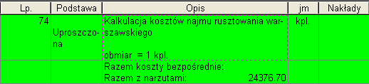 Rys.9. Pozycja kalkulacji kosztów związanych z rusztowaniem.
