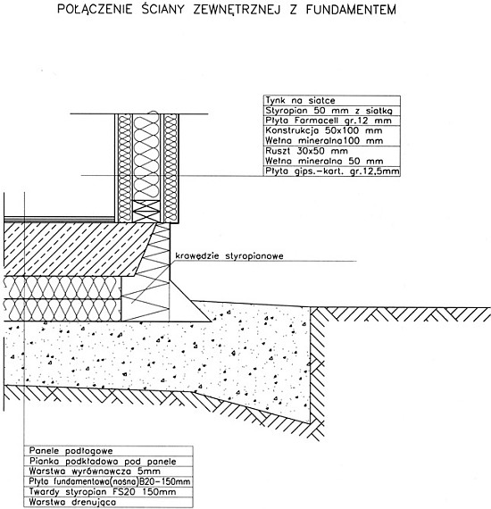 Niepodpiwniczony budynek posadowiono na płycie fundamentowej (nośnej) wykonanej z betonu klasy B20 o grubości 150 mm zaizolowanej twardym styropianem FS20 o grubości 150 mm; ściany zewnętrzne izolowane 100+50 mm wełny mineralnej oraz 50 mm styropianu; strop nad nieużytkowym poddaszem zaizolowano wełną mineralną o grubości 100 mm. Zastosowano też szereg rozwiązań utrudniających przepływ ciepła z budynku do otoczenia. W efekcie pozwoliło to na uzyskanie znakomitych współczynników E0 = 30,3 kWh/(m3 rok) oraz 96,1 kWh/(m2 rok), czyli znacznie poniżej określonych w rozporządzeniu w sprawie warunków technicznych jakim powinny odpowiadać budynki i ich usytuowanie[1].