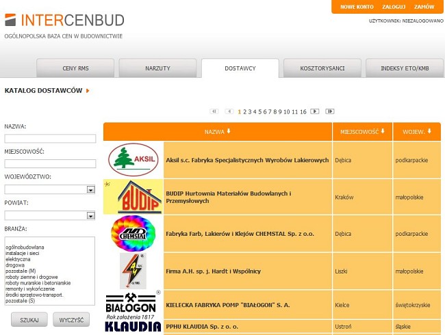 Cóż jeszcze ciekawego? Niezłe wrażenie (pozytywne) robi katalog dostawców – nie liczyłem dokładnie, ale będzie ich pewnie z 300. Z tej bazy dowiemy się wszystkiego o dostawcy lub producencie, znajdziemy jego dane teleadresowe oraz asortyment (z cenami), którym dysponuje. Tu również dostępna jest wyszukiwarka – możemy szukać po nazwie firmy, miejscowości, województwie, a także po branży – do koloru do wyboru.