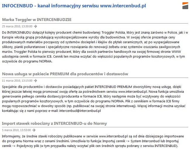 To niemalże wszystko z czego można skorzystać na stronie Intercenbudu. Dodać jednakowoż należy, że dostępny jest również kanał RSS (ciekawe, kto ze starszych kosztorysantów wie co to takiego?). Przyznaję się bez bicia, ja też nie wiedziałem, dopóki nie kliknąłem na ikonkę. Otóż kanał RSS to nic innego, jak kanał informacyjny. Czytnik kanałów pozwala wczytywać nagłówki wiadomości publikowanych w kanałach informacyjnych dostępnych w Internecie. Nagłówek zawiera tytuł, zwięzły opis oraz link odsyłający do bardziej szczegółowej informacji znajdującej się w serwisie prowadzonym przez wydawcę kanału (może być nim każda osoba prowadząca serwis www). Czytnik RSS pozwala śledzić wiele kanałów jednocześnie. Zazwyczaj program jest dostarczany z predefiniowaną listą kanałów, ale użytkownik może do nich dodawać nowe, organizując je w grupy tematyczne – a te mądrości to już przytaczam za Wikipedią. Skoro więc i w Intercenbudzie jest możliwość pozyskiwania ciekawych wiadomości poprzez ten kanał, czemu by z niego nie korzystać.