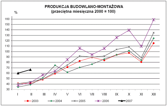 [1] przyp. red. – wg danych GUS z 21 maja 2007 – Poziom produkcji budowlano-montażowej zrealizowanej w okresie styczeń-kwiecień 2007 r. był o 50,4% wyższy niż w analogicznym okresie ub. roku.
