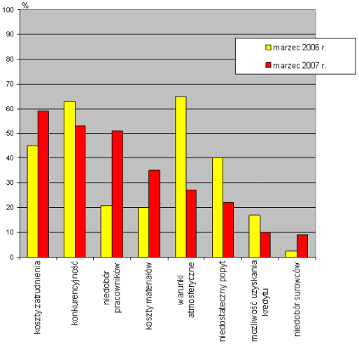 - warunki atmosferyczne - w marcu 2007 r. tę barierę wskazało 27% jednostek, co w porównaniu z 65% w roku ubiegłym, łatwo wytłumaczyć łagodną zimą