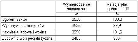 Różnice w poziomie płac w zależności od rodzaju robót są niewielkie. W 2010 r. przeciętne miesięczne wynagrodzenie w sektorze budownictwa wynosiło 3538 zł. Wynagrodzenie w działalności „wykonywanie budynków” (budownictwo ogólne) było o 0,1% niższe, w inżynierii lądowej i wodnej (łącznie z budownictwem drogowym) było o 1,6% wyższe, a w budownictwie specjalistycznym o 1,6% niższe w porównaniu do wynagrodzenia przeciętnego dla całego sektora.