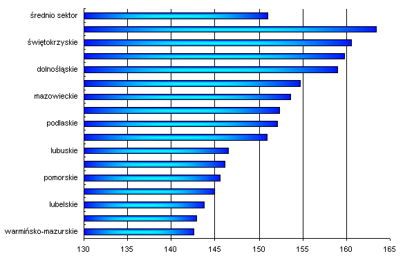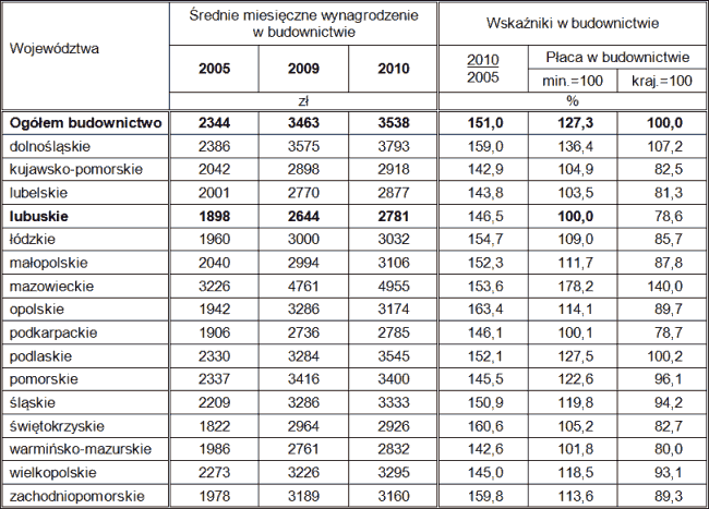 Przy średnim wskaźniki wzrostu płac w sektorze budownictwa w 2010 r. do 2005 r. wynoszącym 151, w 8 województwach wskaźnik ten był wyższy od średniego (wynosił od 152,1 do 160,6), ale w pozostałych wzrost też był relatywnie wysoki (najniższy wskaźnik wynosił 142,6).