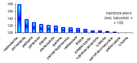 - Różnice w poziomie wynagrodzenia w poszczególnych województwach są bardzo duże; między płacami najwyższymi i najniższymi sięgają nawet 70% – 80%. Płace rosną we wszystkich województwach, ale dysproporcje między województwami mają charakter trwały i dotyczą tych samych regionów.