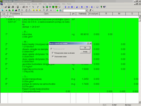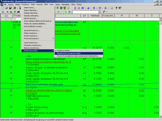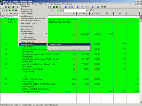 W tym celu wybieramy z menu [Kosztorys] -> „Rejestracja zmian” -> „Rejestruj zmiany”.