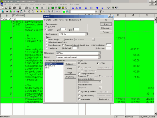 Następnie dodajemy do zestawu („Wydruki w zestawie”) -> „strona tytułowa” + „tab.elem.scal” + „oferta”.