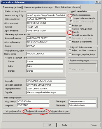 W zestawie wybieramy nasz nowy zestaw -> „Kosztorys ofertowy (Urzędy)”. Następnie podświetlamy „strona tytułowa” i po naciśnięciu klawisza Opcje przechodzimy do karty „Edycja strony tytułowej”. W zakładce „Opcje druku strony tytułowej” w sekcji „Umieść na wydruku” zahaczamy -> „Stawkę roboczogodz.” oraz -> „Narzuty”. Po czym w dolnej części ekranu naciskamy klawisz Zachowaj jako domyślne i OK. W ten sposób mamy przygotowany interesujący nas zestaw.