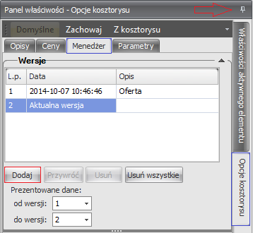 Zacznijmy od początku. Co zrobić, aby aktywować śledzenie zmian w kosztorysie? W tym celu należy w prawym panelu – „Opcje kosztorysu” – kliknąć w zakładkę „Menedżer”, w której znajdują się polecenia pozwalające zarządzać wersjami kosztorysu. Domyślnie w każdym pliku jest tylko jedna wersja, ale przyciskiem „Dodaj” można utworzyć kolejną.