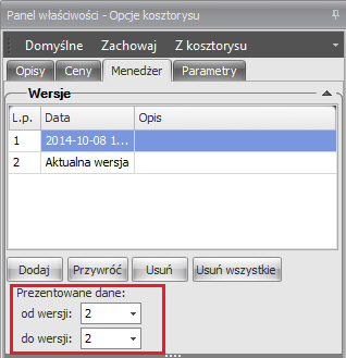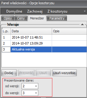Mechanizm rejestracji można również zastosować przy wycenie starego kosztorysu aktualnym cennikiem. Dzięki temu będzie dokładnie widać, które ceny uległy zmianie i o ile. Jak to zrobić? W zakładce „Menedżer” należy dodać kolejną wersję, a następnie ustawić prezentację od wersji: „2” do wersji „3”.