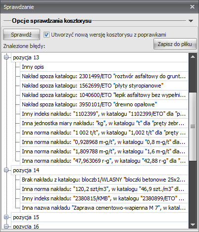 Po zakończeniu sprawdzania zostanie wyświetlona lista z wykazem różnic między kosztorysem a baza katalogową.