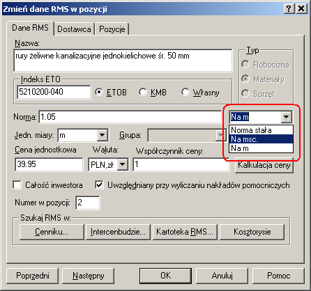 Obok pola z wartością normy mamy w tym oknie rozwijalną listę jednostek obmiaru możliwych do zastosowania w tej pozycji. Zaznaczamy jednostkę msc., która jest jednostką obmiaru głównego i zatwierdzamy przyciskiem OK. W tym momencie w pozycji z Rys.1. zniknie wiersz o treści 1.5m będący określeniem wartości obmiaru dodatkowego a normatyw zużycia rur będzie odnosił się do ilości miejsc, w których wymieniać należy odcinki rur, a nie do długości tych odcinków. Drugi obmiar jednak w pozycji pozostanie, tyle, że niewidoczny i niemający żadnego wpływu na wartość pozycji.